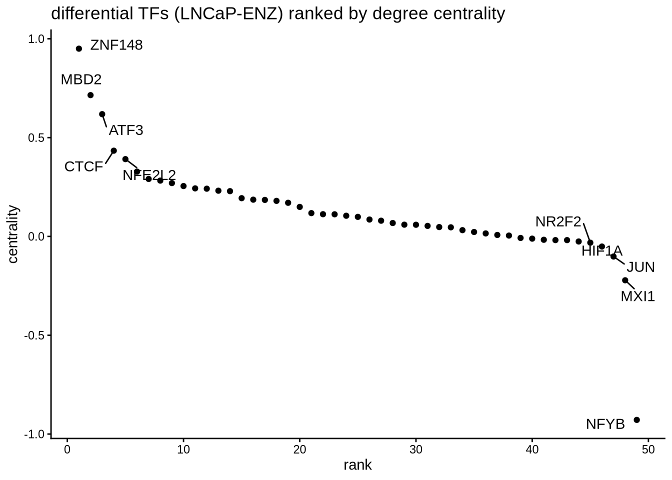 theme_classic() + ggtitle ("differential TFs (LNCaP-ENZ) ranked by degree centrality")