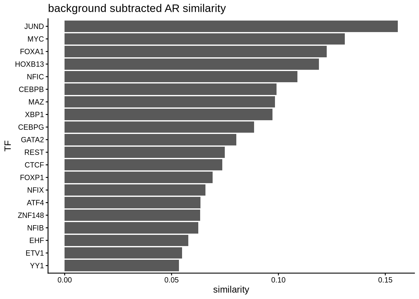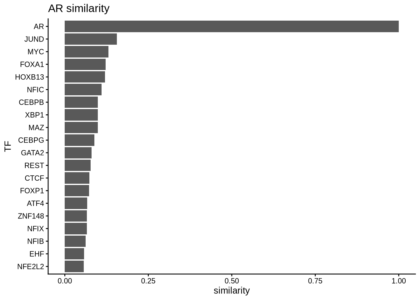 Sometimes, we are interested to identify interaction partners of the TFs of interest. This can be achieved by comparing the overlap of the targets genes for all the TFs and identify the most similar TFs by Jaccard similarity. To illustrate this function, we take a look at the top most similar 20 TFs to AR.