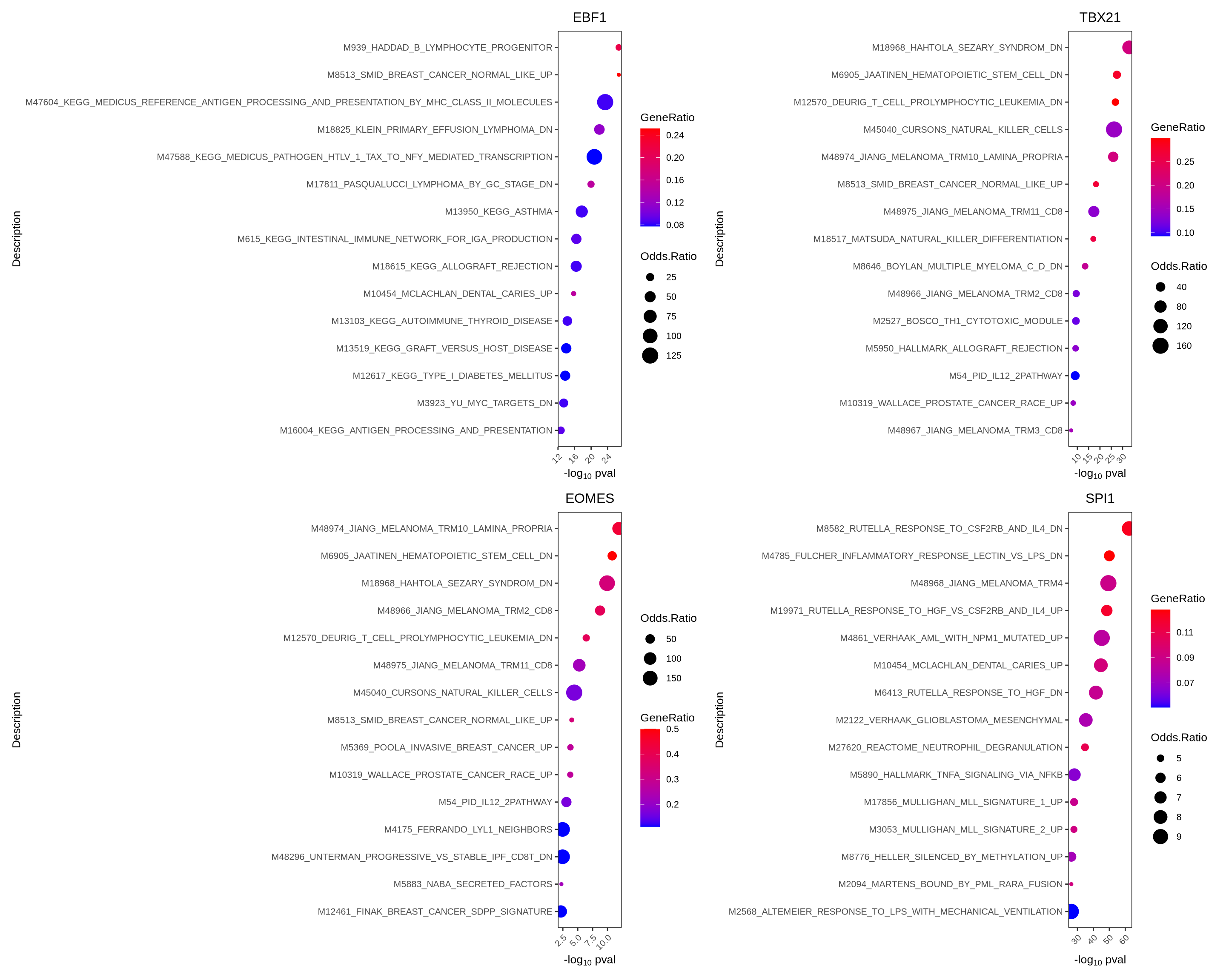 Here we first download Hallmark and C2 signatures from MSigDB and then perform gene set enrichment of the known lineage factors. As expected, EBF1 shows enrichment for pathways associated with B cells, and TBX21 with T cells, EOMES with NK cells, and SPI1 with myeloid cells.