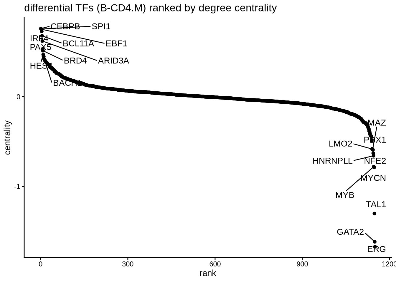 theme_classic() + ggtitle ("differential TFs (B-CD4.M) ranked by degree centrality")